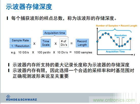 當(dāng)我們測(cè)量一個(gè)信號(hào),在不同采樣情況之下,采樣的結(jié)果誤差特別大。采樣率不夠,就是你帶寬不夠,看到的是上面的濾波的效果,所以我們要時(shí)刻提出采樣率,對(duì)于采樣率而言非常著名人提出的定理,這個(gè)老先生告訴我們,采樣率是信號(hào)的兩倍,才能保證你的信號(hào)的準(zhǔn)確率。采樣率決定捕獲信號(hào)的時(shí)間分辨率,時(shí)間分辨率越高,可以察看的波形細(xì)節(jié)越多,但可以捕獲的時(shí)間窗口會(huì)下降。我的個(gè)人經(jīng)歷是取決于你想要采集什么樣的信號(hào),采集到什么程度。如果我測(cè)量的是發(fā)波,我就要看它的周期,你的采樣率是6個(gè)點(diǎn),可能誤差只有1%。我們希望我們采的信號(hào),感興趣的細(xì)節(jié)可以采到3到5個(gè)點(diǎn),最好是5個(gè)點(diǎn),當(dāng)然采更多點(diǎn)的意義就不大了。為什么采更多點(diǎn)意義不大呢?因?yàn)椴蓸勇食瞬蓸訒r(shí)間,等于示波器的產(chǎn)品的深度,產(chǎn)品太大了,會(huì)消耗你很多的時(shí)間,單位時(shí)間采的點(diǎn)太多,這個(gè)波形時(shí)間就太短,所以一般建議采到3到5個(gè)點(diǎn)。