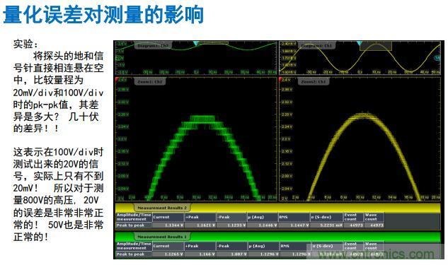 很多人覺得不可思議,為什么零伏的測(cè)試信號(hào)是30伏呢?就是這個(gè)原因。因?yàn)榘雽?dǎo)體的制作工藝的原因就是這里。當(dāng)100伏/格的時(shí)候,正常測(cè)量的范圍是800伏除以256,最終結(jié)果差不多是30。這個(gè)是高壓測(cè)量的例子。所以平時(shí)用示波器測(cè)量電源的文波的時(shí)候,我們應(yīng)該怎么做?如果是測(cè)量3.3伏的電流波,永遠(yuǎn)要把探頭在地上的帽子拔掉,這個(gè)用短的地環(huán)。如果測(cè)1.8伏以下的電流波,紋波只有3豪伏以下的時(shí)候怎么做?勇敢要把探頭拔掉。為什么?因?yàn)楹芏嗵筋^插上去之后,最小是1毫伏/格,直接就變成了10毫伏/格,你的示波器的量化、噪聲,加上隨機(jī)噪聲,遠(yuǎn)遠(yuǎn)的大于你的被測(cè)信號(hào)的噪聲,測(cè)量的結(jié)果就失去意義了。所以我們講的第一個(gè)原則就是量化最小測(cè)量誤差。