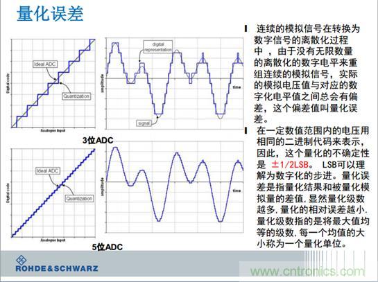 我們復(fù)習(xí)一下示波器的基本原理,把模擬信號(hào)變成影響點(diǎn)的各個(gè)。在數(shù)字空間里,永遠(yuǎn)都有0和1,每一個(gè)0和1代表的電壓的大小是多少呢?通常是8位的0和1組成一個(gè)電壓。電阻里的電源的電壓是400伏,還是低壓5毫伏,都可以進(jìn)行量化。每一個(gè)0和1代表的電壓是多少呢?這個(gè)是最小有利的比特位。特殊講,就是示波器的每一個(gè)路徑,示波器乘1111111,變成了11111110,最后一位從1變成0的跳變,代表了電壓的大小是多少呢?是取決于平時(shí)用示波級(jí)的量程。如果示波器1伏每格的時(shí)候,你0和1的跳變大約是30毫伏的變化。這個(gè)是示波器外邊的電壓的變化,30毫伏的電壓對(duì)示波器是沒有影響的,示波器感覺不到。這個(gè)就像平時(shí)用1厘米的刻度尺來測(cè)量頭發(fā)的時(shí)候發(fā)現(xiàn)無法測(cè)量,這個(gè)是基本的道理。
