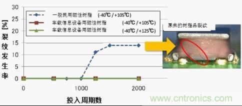 熱沖擊試驗(yàn)投入的循環(huán)數(shù)和開裂發(fā)生率的關(guān)系如圖3所示。可以得知,與面向一般民用市場(chǎng)的磁性樹脂在1000次循環(huán)試驗(yàn)以內(nèi)會(huì)發(fā)生開裂相比,我們開發(fā)出的用于車載信息設(shè)備的磁性樹脂在2000次循環(huán)之后仍未發(fā)生開裂現(xiàn)象。并且,已經(jīng)確認(rèn)在更為嚴(yán)酷的環(huán)境下---40℃↔+125℃中進(jìn)行的熱沖擊試驗(yàn)也沒有發(fā)生開裂現(xiàn)象。