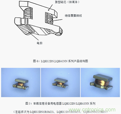 LQH32DN、LQH43NN系列是為了適應(yīng)大電感值領(lǐng)域的車載電感市場(chǎng)的需求所設(shè)計(jì)的,它的最高使用環(huán)境溫度可達(dá)105℃,是一種無磁性樹脂型的繞線電感器。為了降低由于鼓型磁芯開裂及絕緣覆膜銅線的熱膨脹收縮引起的斷線風(fēng)險(xiǎn),因而采用了無樹脂結(jié)構(gòu)。結(jié)構(gòu)概略圖如圖4,產(chǎn)品照片如圖5所示。