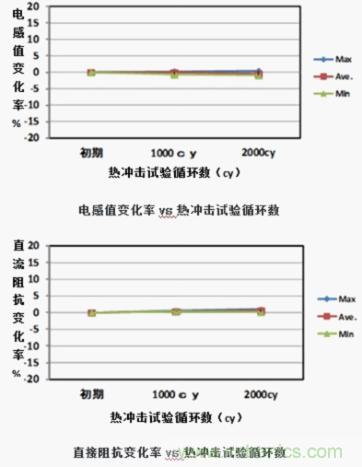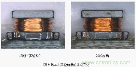 圖6、7所示為關(guān)于LQH43NN222K03在-40℃↔+105℃/2000循環(huán)熱沖擊試驗(yàn)前后的外觀照片,主要電氣特性的變化。在熱沖擊試驗(yàn)后,沒有發(fā)現(xiàn)鼓形磁芯的開裂及電線斷線等不合格現(xiàn)象。另外,關(guān)于主要的電氣特性,變化率也控制在±1%以內(nèi),是滿足了車載用元器件性能要求的產(chǎn)品。