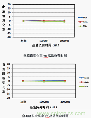 在圖8中,顯示了對(duì)于LQH43NN222K03在+105℃環(huán)境下,接通額定電流后的高溫負(fù)荷試驗(yàn)中的主要電氣特性變化。電氣特性的變化在±1%以內(nèi),外觀未發(fā)現(xiàn)明顯異常。通過采用耐熱性等級(jí)高的電線,在高溫環(huán)境下也能保持高可靠性。