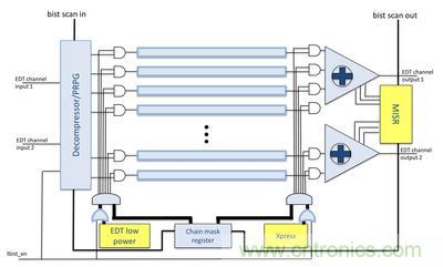 圖2:混合壓縮邏輯架構(gòu)和邏輯內(nèi)建自測(cè)試共享大部分解壓?jiǎn)卧?LFSR 和壓縮單元/MSIR 邏輯。