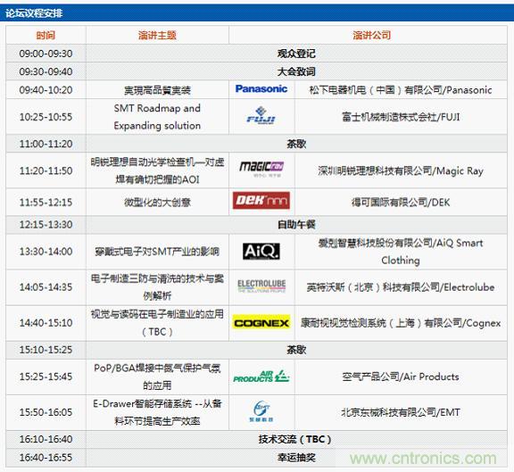 據(jù)主辦方介紹,為期一天的論壇將結合嘉賓演講和產(chǎn)品展示兩大形式為到場專業(yè)觀眾提供豐富的視聽體驗,更為電子制造設備/系統(tǒng)/方案使用者提供了深入了解供應商“智”造服務的良好機會。在嘉賓演講版塊,主辦方邀請到來自Panasonic(松下)、Fuji(富士機械)、明銳理想、DEK(得可)、英特沃斯、康耐視、空氣產(chǎn)品、東械等涵蓋電子制造全產(chǎn)業(yè)鏈各生產(chǎn)環(huán)節(jié)的領先供應商代表。在現(xiàn)場產(chǎn)品展示方面,與會觀眾更有機會近距離體驗來自Fuji(富士機械)、明銳理想、DEK(得可)、華普通用、英特沃斯、善思光電、章和電氣、首為國際(APOLLO SEIKO)、Praxair(普萊克斯)、東星科技、日本奧泰斯(OPTEX FA)等優(yōu)質(zhì)供應商提供的先進技術及設備。
