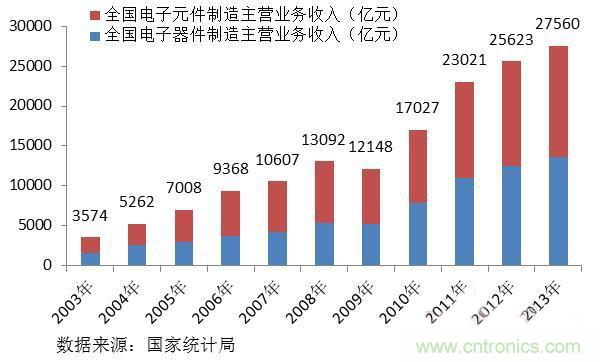 電子元器件是我國電子信息產(chǎn)業(yè)中的重要門類,產(chǎn)值比重約占電子信息產(chǎn)業(yè)的五分之一。2003-2013年,我國電子元器件行業(yè)增速迅猛,年復(fù)合增長達到了22.7%,從2003年的3574億元增長到2013年的2.76萬億元。其中,2013年電子器件制造和電子元件制造主營業(yè)務(wù)收入分別達到1.39萬億和1.36萬億元。