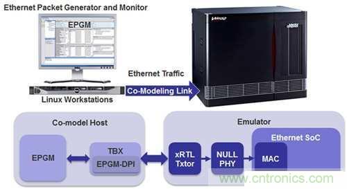 將這種設置與采用虛擬方法的設置進行比較,如明導國際(Mentor Graphics)的虛擬乙太網設備(VirtuaLAB)。在此場景中,裝有Linux環境的工作站連接硬體加速器,在工作站上用軟體對乙太網測試儀實現一樣的行為模式?;诔墒斓膶崿F智慧財產權(IP),模型準確再現了實際的物理測試儀。