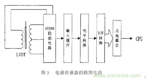 如圖3所示,由于采用了最新的大規模集成電路,電感傳感器的檢測電路比較簡單,且集成電路采用了新的調制解調方法和算法,減少了以前的檢測外差式調頻檢測電路方法由于傳感器的激勵信號的相角、頻率以及幅值漂移對檢測結果的影響,大大進步了檢測精度和穩定性。