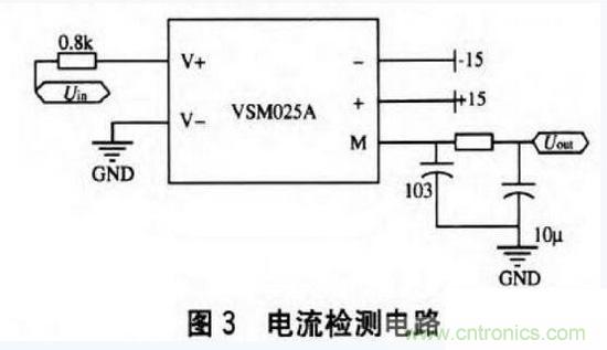 系統所要檢測的信號采用霍爾傳感器法檢測,如被測電源設備向該簡易直流電子負載輸入的電壓,以及流進負載的電流。電壓和電流檢測分別通過電壓霍爾、電流霍爾傳感器檢測,并經過必要的輸出轉換電路后轉換為檢測信號。為了提高系統的抗干擾性,檢測信號經過一個低通濾波器濾除噪聲,再送入單片機的AD轉換器中。其中電流霍爾的原理圖如3所示。