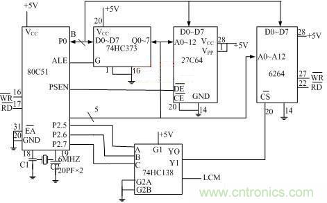 在80C51單片機(jī)中,外部I/O口是作為外部RAM來(lái)擴(kuò)展的,選址的方法與擴(kuò)充外部RAM的方法完全相同。本電路除了外部的RAM外,還有LCD顯示器作為外部I/O器件,因此,只采用線選址方式是不夠的,應(yīng)采用譯碼選址方式。