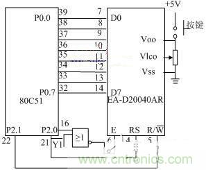 LCM點(diǎn)陣式液晶顯示模塊能顯示的字符多,并且能顯示漢字,因而在智能化測(cè)量控制儀表中得到了廣泛的應(yīng)用。本系統(tǒng)選用的是EPSON公司生產(chǎn)的EA-D20040AR點(diǎn)陣式液晶顯示模塊,它由TN型液晶顯示器、CMOS驅(qū)動(dòng)器和CMOS控制器組成,模塊內(nèi)集成有字符發(fā)生器和數(shù)據(jù)存貯器,采用單±5V電源供電,內(nèi)部有能顯示96個(gè)ASCII字符和92個(gè)特殊字符的字庫(kù)。EA-D20040AR與單片機(jī)80C51的接口電路如圖4所示: