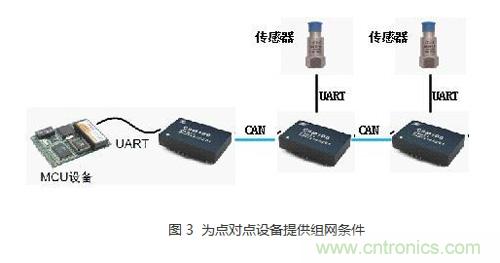我們都知道CAN總線是一種多主總線,可以實現多節點組網通訊,自帶優先級仲裁機制,可有效防止數據沖突?;谶@一優點,可以利用CSM100模塊為點對點通訊設備提供組網的條件。例如,某些串口接口的傳感器,如果我們需要把多個傳感器的數據讀到MCU而MCU的串口數量不足怎么辦呢?