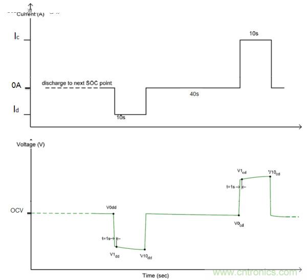 HPPC測試可測得電池的功率性能,開路電壓,直流內阻等重要特性。HPPC測試制度是在某特定SOC目標進行10s脈沖放電,靜置40s,再10s脈沖充電。由此可測得該SOC點充電和放電方向的DCIR。需要注意的是在不同的測試方法下計算的DCIR會存在一定的差異。