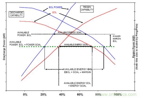 同時電池企業用以評估電池壽命終結的方法(容量衰減至BOL時的80%以下或內阻增加50%以上)是比較籠統的。作為整車廠可以根據實際性能需求進行更準確的EOL確認。下圖以一款混合動力車型電池壽命分析為例:兩條藍線分別是BOL時刻的充放電功率特性,綠色虛線為整車實際需求工況。則在BOL狀態下電池在20%~90%SOC區間內都滿足整車功率需求,在可用能量上有一定的富裕。隨著電池性能的衰減,兩條紅線代表了功率性能的下降,其可用SOC區間為40%~75%,到達EOL零界點。一旦繼續衰減可用容量就無法滿足整車需求。