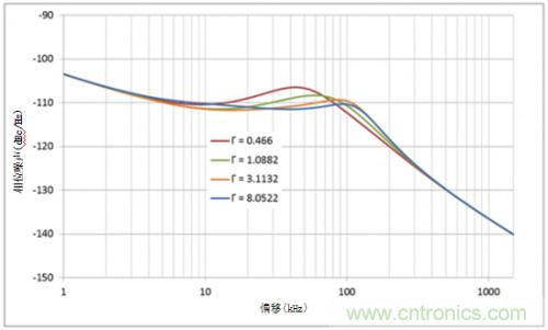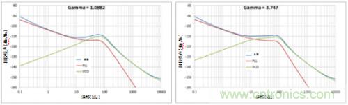圖2所示為伽馬對相位噪聲的影響。回路帶寬和相位邊限相同,而伽馬值不同。伽馬值越高,由于噪聲整形回路濾波器平緩度提升,VCO的提升斜率也會(huì)變低。