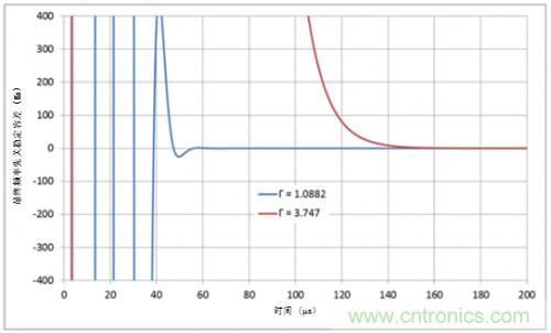但較高的伽馬值也有其蔽處:鎖定時(shí)間更長。圖4所示為不同伽馬值下200MHz頻率躍變的鎖定時(shí)間;回路帶寬和相位邊限保持不變。當(dāng)伽馬值和回路帶寬分別為1和3.7,穩(wěn)定容差在±100Hz范圍內(nèi),模擬鎖定時(shí)間值分別為46.5µs與118µs。