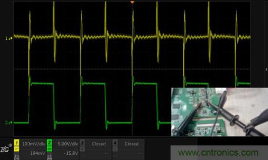 圖5.CH1使用接地彈簧測量電源輸出,CH2使用夾子測量電感,各自接地