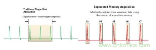 示波器和數字化儀通常都支持分段存儲器技術。有了分段存儲器,您可以使用觸發或選通來選擇性地捕獲波形數據,從而減少所需的采集存儲器容量。