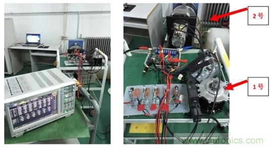 此次測試的對象為小型電機系統,系統分為驅動器、電機平臺、測試,3個部分。驅動器輸出通過電纜連接到電機平臺,電機轉軸上安裝扭矩傳感器,傳感器所有連接線引到測試儀器,傳感器輸出信號接入功率分析儀電機測量單元扭矩BNC接口。傳感器輸出100kHz±50kHz脈沖對應0±5Nm扭矩。
