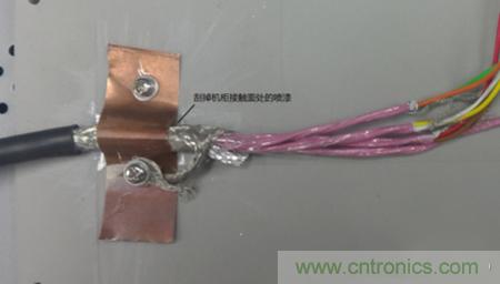 從安全方面考慮,三個機柜都必須接大地,強電線路與信號線分開避免干擾這些都是要遵循的基本原則。實際機柜間位置較遠,接地對于高頻干擾改善不多,只作為安全措施。解決這種問題一般考慮是從干擾源、傳播路徑、敏感設備三方面著手。驅動器和功率分析儀是成型的設備,不便于改動,考慮從傳播路徑入手,使用多芯屏蔽電纜連接扭矩傳感器到測控柜,傳感器端屏蔽層連接到傳感器外殼,也與電機平臺連通,另一側屏蔽層接到測控柜機殼。最初的時候屏蔽層通過一根較長的線連接到測控柜,發現并沒有改善,最后使用銅片將整根線壓到機柜,干擾得到很大衰減。