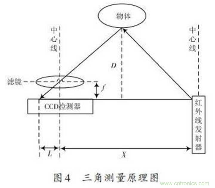 紅外感應(yīng)器包含紅外發(fā)射器與CCD檢測器,紅外線發(fā)射器會發(fā)射紅外線,紅外線在物體上會發(fā)生反射,反射的光線被CCD檢測器接收之后,由于物體的距離D不同,反射角度也會不同,不同的反射角度會產(chǎn)生不同的偏移值L,知道了這些數(shù)據(jù)再經(jīng)過計(jì)算,就能得出物體的距離了,如下圖所示。