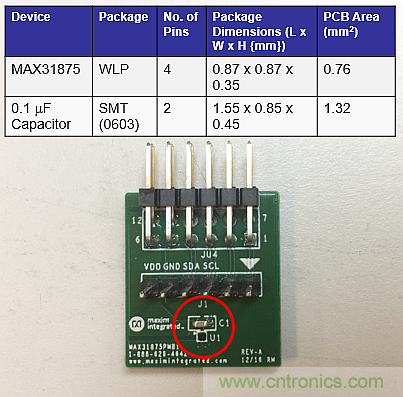 圖2:WLP溫度傳感器(U1/MAX31875)尺寸比SMT的0.1μF電容(C1)小。