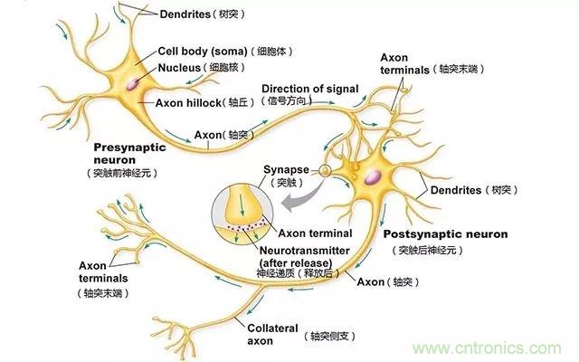 人腦神經(jīng)元在接受到刺激后,其細胞膜內外帶電離子分布將發(fā)生變化,因而形成電位差,電位差將沿著神經(jīng)細胞軸突、樹突雙向傳導,形成脈沖電流。而當該電信號傳遞到突觸時,突觸前神經(jīng)元將釋放神經(jīng)遞質(如多巴胺、腎上腺素)由突觸后神經(jīng)元接受神經(jīng)遞質產生興奮(該過程單向傳遞),并向下傳遞作用與人體反應器并發(fā)生反應。