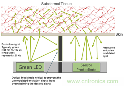 圖1展示了測量心率信號的基本方法,它依賴于用光學(xué)方法從人體組織上提取的心率壓力波。圖1說明了光進(jìn)入皮膚后傳輸?shù)耐緩剑河尚穆蕢毫Σㄒ鸬拿?xì)血管舒張和收縮運(yùn)動對由綠色LED注入人體組織的光信號進(jìn)行了調(diào)制。接收到的信號因?yàn)橥ㄟ^了皮膚而被大大地衰減,它被一個光電管接收并送到電子子系統(tǒng)中去處理。源自脈搏的振幅調(diào)制信號被檢測(過濾掉運(yùn)動噪聲)、分析和顯示。