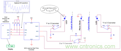 如圖2所示,在一個光電心率系統(tǒng)設(shè)計(jì)中,難以實(shí)現(xiàn)和成本很高的功能模塊分別是:快速的、大電流的驅(qū)動LED的電壓到電流轉(zhuǎn)換器,用于光電管的電流到電壓轉(zhuǎn)換器,以及運(yùn)行算法和對序列信號進(jìn)行處理的MCU。一個可被設(shè)置到低至2mA的很低電流,但同時仍然能產(chǎn)生短至10µs的非常窄的光脈沖低噪聲(75 - 100 dB SNR)300mA LED驅(qū)動器也是一個用分離器件實(shí)現(xiàn)起來非常昂貴的模塊。
