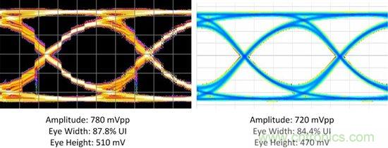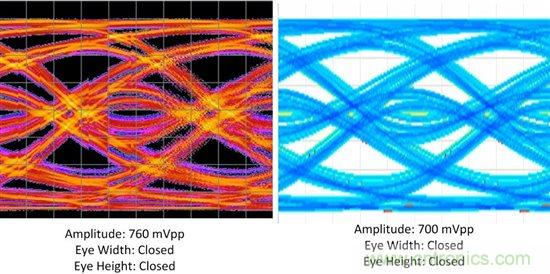 DS125BR820在筆者的系統(tǒng)輸出端打開(kāi)了眼圖。圖2所示的實(shí)例1表明有足夠的余量,看來(lái)DS125BR820能補(bǔ)償更多的通道損耗同時(shí)使眼圖仍能保持開(kāi)啟狀態(tài)。圖3所示的實(shí)例2展示了相反的情況:筆者的通道有太多的損耗,在這些運(yùn)行條件下筆者很可能會(huì)看到誤碼,除非在通道的末端使用接收芯片的均衡功能。