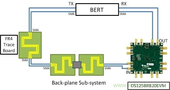 這一切聽(tīng)起來(lái)很棒,但該工具能給您帶來(lái)可靠的結(jié)果嗎?為了回答這個(gè)問(wèn)題,筆者去了實(shí)驗(yàn)室,并進(jìn)行了一些測(cè)量。筆者決定使用一個(gè)速率為12.5Gbps的Linear re-driver DS125BR820EVM、一些FR4印刷電路板(PCB)走線以及具有SMA連接器、適用于背板子系統(tǒng)的子卡。圖1展示了筆者的簡(jiǎn)單設(shè)置。使用一個(gè)誤碼率測(cè)試器(BERT)作為為本次研究的發(fā)送器及接收器)。