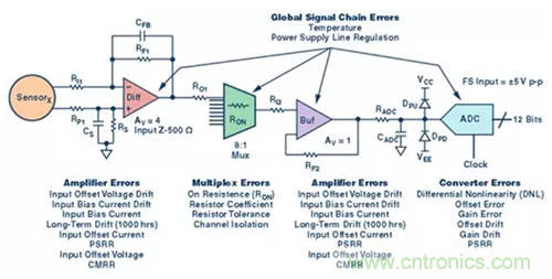 無源和有源器件都會出現多種誤差。并非所有誤差都很重要,但要記住對信號鏈應用重要的那些誤差。并非所有誤差對每種應用都有效。在進行任何直流精度誤差分析時,決定最重要或者影響最大或權重最大的誤差有哪些,這是必不可少的步驟。