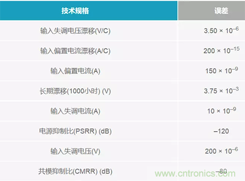 眾所周知,放大器還遠遠沒有達到理想水平。它們有許多誤差,一般都列示于數據手冊當中。失調電壓和偏置電流是兩種常見的誤差,但同時也要考慮任何漂移誤差、長期誤差和隔離誤差(如電源抑制比(PSRR))。表1列出了在使用放大器時應考慮的下列誤差。