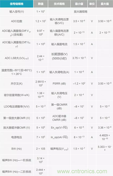 花些時間編制一份電子表格,使其布局合理、有序。在表格頂部,定義全局誤差和信號鏈規格,因為這些數據會影響整個信號鏈的性能。放大器規格/誤差也放在頂部,因為整個信號鏈中有多種誤差和兩個放大器級。