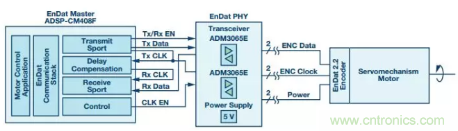本文討論的EnDat接口是在ADI的ADSP-CM40x上實現(xiàn),后者是一款針對電機(jī)控制驅(qū)動器而開發(fā)的處理器。除了脈寬調(diào)制器(PWM)定時器、模數(shù)轉(zhuǎn)換器(ADC)和sinc濾波器等用于電機(jī)控制的外設(shè)以外,ADSP-CM40x還有高度靈活的串行端口(SPORT)。
