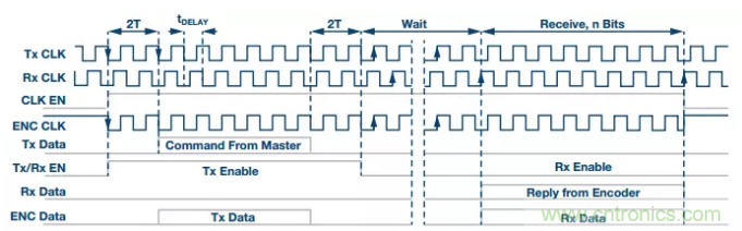 來自處理器的時鐘信號是連續(xù)的,而EnDat協(xié)議規(guī)定,時鐘只能在通信期間施加于編碼器。在所有其他時候,時鐘線路必須保持高電平。為此,處理器產(chǎn)生一個時鐘使能信號CLK EN,其被送至ADM3065E數(shù)據(jù)使能引腳。恰好兩個時鐘周期(2T)之后,主機(jī)開始在Tx DATA上發(fā)出命令。命令有6位長,隨后是兩個0位。為了控制收發(fā)器的數(shù)據(jù)方向,處理器在傳輸時將Tx/Rx EN位置1。