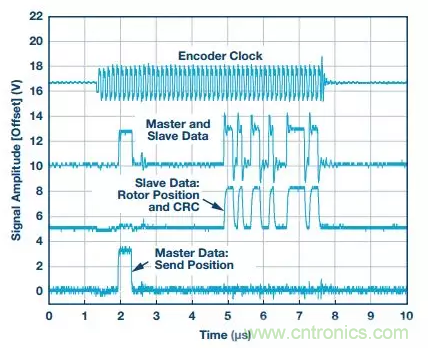 EnDat 2.2測試設(shè)置如圖4所示。EnDat從機(jī)是Kollmorgen的一款標(biāo)準(zhǔn)伺服電機(jī)(AKM22),EnDat編碼器(ENC1113)安裝在軸上。三對線(數(shù)據(jù)、時鐘和電源線)將編碼器連接到收發(fā)器板。EnDat PHY上有兩個收發(fā)器和用于編碼器的電源。一個收發(fā)器用于時鐘,另一個收發(fā)器用于數(shù)據(jù)線路。EnDat主機(jī)由ADSP-CM40x結(jié)合標(biāo)準(zhǔn)外設(shè)和軟件而實現(xiàn)。發(fā)送端口和接收端口均利用靈活的SPORT實現(xiàn)。