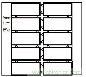 工藝邊用于在自動化貼片時,貼片機需要夾住板子的邊緣進(jìn)行貼片,通常只需要加兩邊即可。工藝邊寬度的選擇通常比較寬泛,可以選常用的9mm。注意工藝邊只是在貼片生產(chǎn)時用到,在元件組裝完后就可以掰掉的。開發(fā)人員在畫板子的時候不需要把工藝邊給畫上去,但是需要在發(fā)給廠家的文件中需要注明。工藝邊如下圖所示: