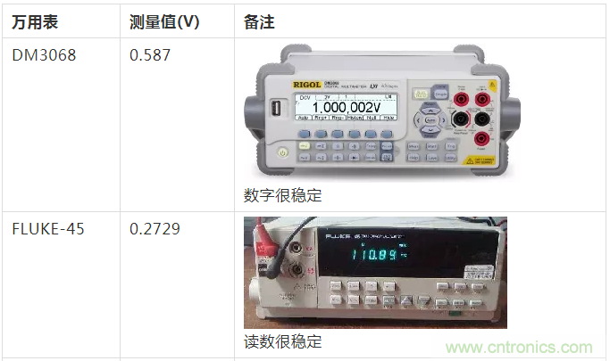 其中,讀數最高的是DM3068六位半的數字萬用表,但顯示數值也僅有0.587V,比信號源輸出的1V低了42%。