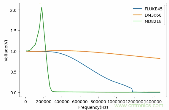 由于萬用表各自的頻率曲線不同,所以所測量隨機噪聲有效值減少的比率也不同。下面是利用同樣的方法測量得到的FLUKE45, MD8218數字萬用表的頻率曲線。