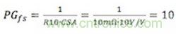 LM25116評估板的功率級跨導(dǎo)由10mΩ的電流檢測電阻(R11)和電流檢測放大器增益(10)設(shè)定,并滿足10A的電流極限。最終的功率級跨導(dǎo)等于: