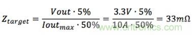 拿12V輸入、3.3V/10A輸出VRM要求作為例子,目標(biāo)阻抗的計(jì)算公式是: