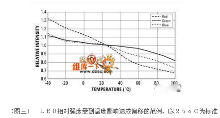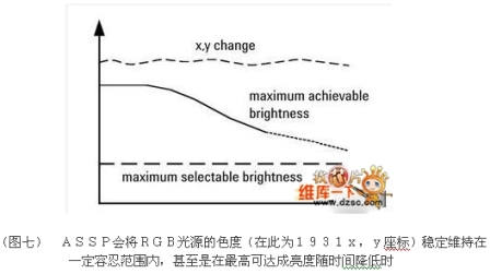 另一點(diǎn)相當(dāng)重要,同時(shí)必須注意的是,當(dāng)LED使用時(shí)間越久,光輸出強(qiáng)度就會(huì)降低,因此經(jīng)過一段時(shí)間后,RGB LED系統(tǒng)的最大可輸出亮度將會(huì)下降,雖然在大部分的應(yīng)用事實(shí)上都可以接受逐漸且穩(wěn)定的亮度衰減,但有時(shí)無法接受的是RGB發(fā)光系統(tǒng)色度的變化,ASSP擁有能夠穩(wěn)定控制RGB發(fā)光系統(tǒng)光度衰減的功能,例如維持色度的穩(wěn)定在一定的容忍度內(nèi),甚至當(dāng)最高可輸出亮度下降時(shí)。