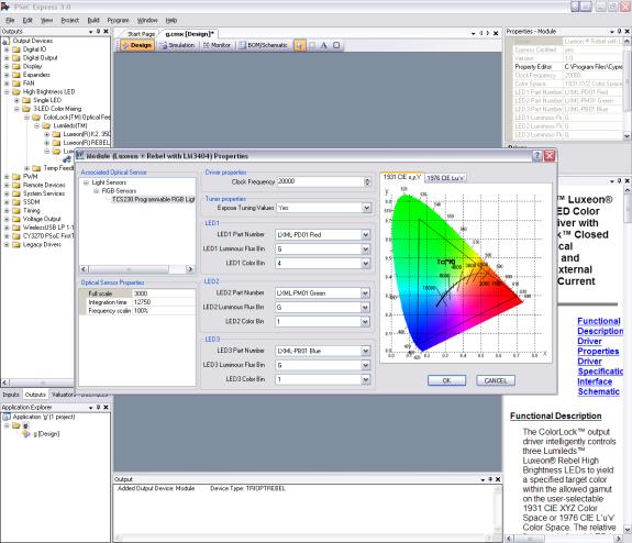 許多色彩系統(tǒng)設(shè)計(jì)擁有不同的回饋方法,需要花數(shù)個(gè)月的時(shí)間來開發(fā)韌體。解決bin的調(diào)整、溫度補(bǔ)償、或更高精準(zhǔn)度的色彩回饋系統(tǒng)以及校正,都需要了解色彩科學(xué)以及精準(zhǔn)的傳感器讀數(shù)。在展開任何高亮度LED設(shè)計(jì)時(shí),強(qiáng)烈建議您先了解這些相關(guān)名詞。幸運(yùn)的是,當(dāng)您進(jìn)入市場時(shí),能利用Cypress Semiconductor所提供快速且輕易的PSoC Express 3.0解決方案,協(xié)助您快速展開研發(fā)。所有這些不同的回饋解決方案,以及高亮度LED的補(bǔ)償機(jī)制,都收錄在一個(gè)簡單易用的圖形化接口,讓您僅須使用下拉式選單以及各種校正技巧,就能完成這些設(shè)計(jì)。