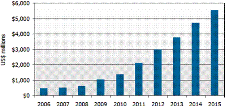 圖一 : 2006-2015 全球OLED面板出貨金額與預測