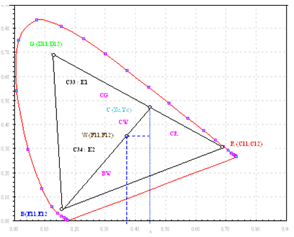 這是需要明確的一點是,混合色的色品座標與已知色的色品座標之間沒有線性疊加的關系,而混合色的三刺激值與已知色之間存在著線性疊加的關系。因此,在顏色相加混合計算中總是先計算三刺激值,再求色品座標。