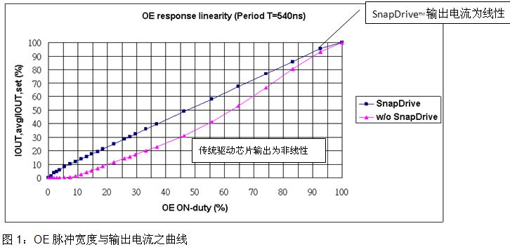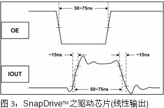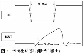 以下為臺(tái)灣迅杰科技推出包含SnapDriveTM技術(shù)之驅(qū)動(dòng)芯片測(cè)試條件及結(jié)果,藉圖1及圖3可以明顯看出其驅(qū)動(dòng)芯片在極小的OE脈沖寬度下其輸出電流仍為線性輸出,而傳統(tǒng)驅(qū)動(dòng)芯片則無法提供線性的輸出。