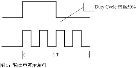 解決LED熱的問題及增加LED的壽命如圖5所示為50%Dutycycle的電流輸出示意圖,若在同一個(gè)時(shí)間內(nèi)將出電流的脈沖平均打散,不但不影響輸出電流及LED的亮度也可以避免LED長時(shí)間的點(diǎn)亮造成LED過熱及壽命提早衰減的現(xiàn)象。[page]