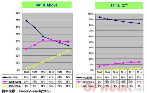 DisplaySearch預(yù)估,減少動(dòng)態(tài)模糊(Motion Blur)、達(dá)成品牌區(qū)隔、消費(fèi)者喜好及提高毛利率將為帶動(dòng)120Hz、240Hz液晶面板需求的主要?jiǎng)恿Γ^察32寸、37寸及40寸以上液晶面板,50Hz/60Hz比重明顯下降;反之,120Hz/240Hz比例有上升趨勢(shì),尤其在40寸以上最為明顯(如圖1)。