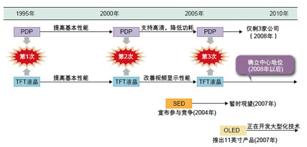 在液晶顯示器市場剛開始啟動的1998年,當時的夏普公司社長(現(xiàn)任董事長)町田勝彥的發(fā)言震驚了整個行業(yè)。他表示: “到2005年,夏普在日本國內(nèi)銷售的電視將全部采用液晶屏。” 當時,液晶電視并未普及,在夏普公司內(nèi)部對于彩色液晶屏也并沒有十足的把握。但是,這一句話成為液晶電視掃蕩市場的導火索,那以后,液晶電視以超乎町田勝彥預想的驚人速度推廣開來。在此過程中,液晶與PDP(等離子)、SED(表面?zhèn)鲗щ娮影l(fā)射顯示)等技術(shù)展開了激烈的競爭(見圖3)。